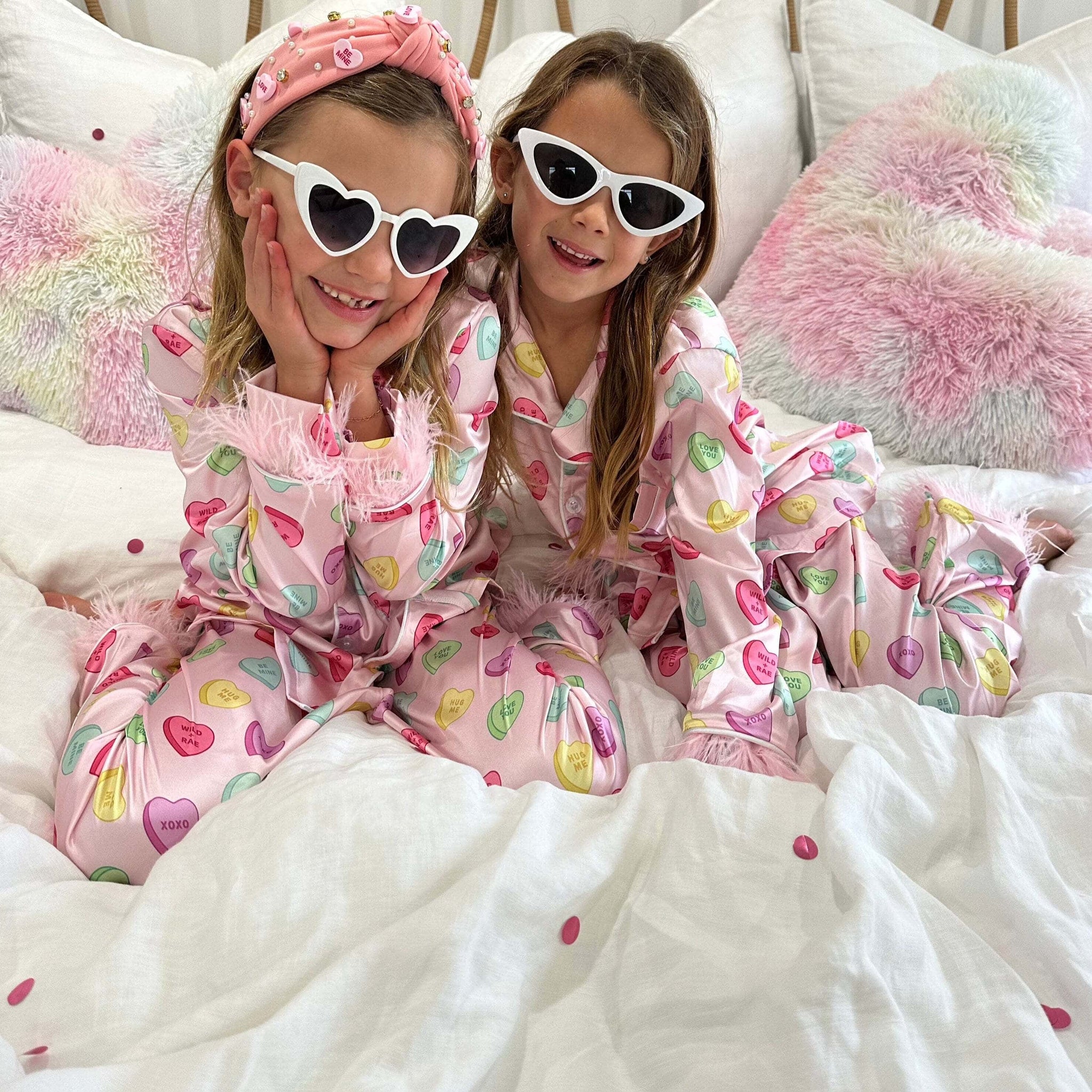 Trimmed with removable feather detailing for that extra flair and easy washing thanks to our signature design these pajamas are perfect for Valentine’s Day sleepovers or matching all month long.
