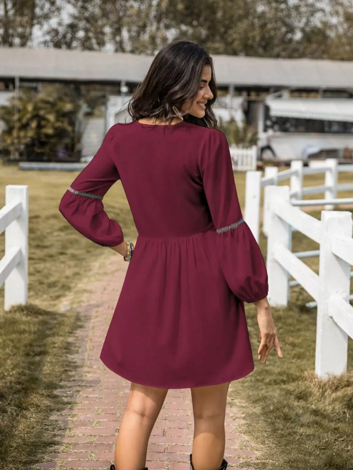 Meadow Whisper Mini Dress with Long Sleeves and Contrast Trim